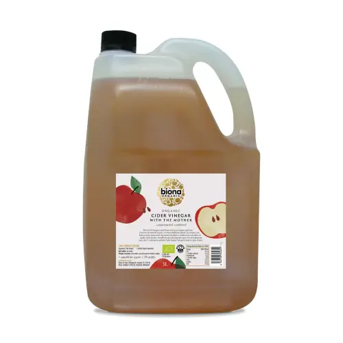 Made from pressed organic apple juice fermented with its vinegar Mother, our organic cider vinegar is aged in wooden casks for a robust finish. Its rich aroma and fruity, tangy taste are underpinned by a host of valuable enzymes, making this cider vinegar delicious and naturally healthy. Our raw, unfiltered vinegar is neither heat-treated nor pasteurised, therefore preserving all the nutritional benefits of the vinegar enzymes. Our ACV with Mother is extremely versatile. Use in salad dressings and sauces for a moreish zing. For an invigorating tonic, mix 1-2 tablespoons of Biona cider vinegar with honey in a glass of water and enjoy immediately. Our cider vinegar is pure and unfiltered, which can result in cloudiness or sediments. This does not affect its quality. 5% acidity