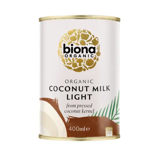 Biona Organic Coconut Milk – Light is a reduced fat version of this popular cooking ingredient with just 9% fat. Made from certified organic coconuts, this coconut milk can be used in Indian and Thai cuisine to give dishes a rich, sweet and silky finish, but with less fat than traditional coconut milk.