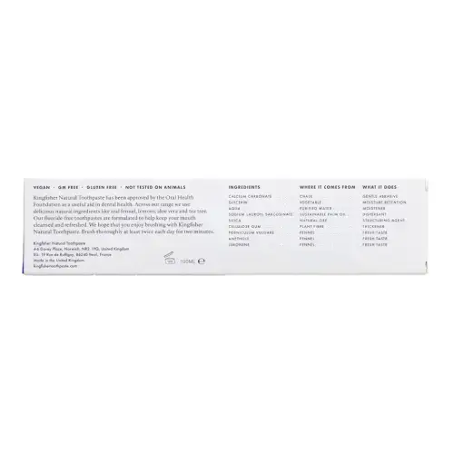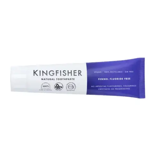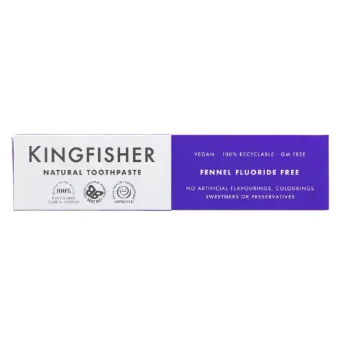 A natural, fluoride free toothpaste from Kingfisher, made without any artificial sweeteners, flavourings, colourings or preservatives. In a delicious fennel flavour without mint, the cruelty free toothpaste is suitable for vegans, gluten free and GM free. Regular brushing with Kingfisher natural toothpaste will keep your teeth clean, help remove plaque and leave you with a healthy, fresh mouth.