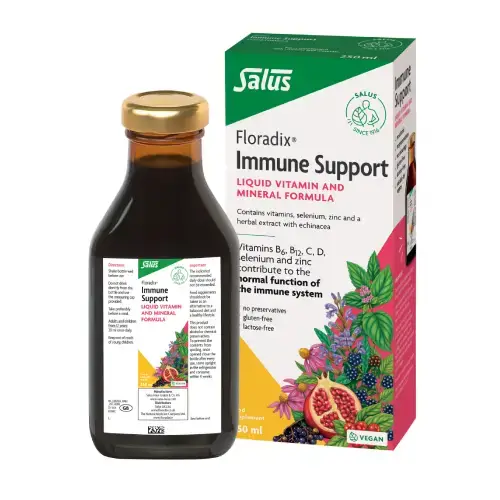 Floradix Immune Support is based on an aqueous herbal extract from selected plants with echinacea and a mixture of fruit juice concentrates, which give it a great fruity taste.