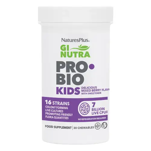 NaturesPlus GI NUTRA ProBio Kids is a superior quality, science-backed supplement, providing robust nutritional support. A healthy gut is essential to vibrant overall wellness. The bacteria in our gut provide an astonishing number of health-supporting benefits that keep us on our toes and make us function optimally. Poor diet and lifestyle choices and other factors tend to disrupt gut bacterial balance. However, evidence shows that supplementing with key species can help restore balance. A properly balanced gut with the right amount of “good bacteria” can greatly help improve everything about your life. NaturesPlus GI NUTRA ProBio Kids offers 16 unique strains and 7 billion live bacteria specifically studied for kids’ guts.