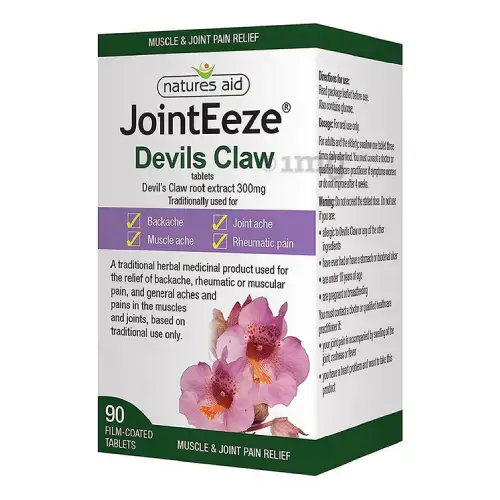 Natures Aid JointEeze is made with Devil’s Claw, a tradition herbal medicinal product used to relieve backache, rheumatic or muscular pain, and general aches and pains in the muscles and joints. This plant is named for its fruit that has large woody hooks to disperse seeds. The medicinal part of the plant, however, is the swollen secondary root.