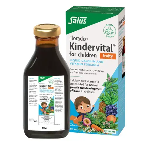 Floradix Kindervital fruity is a delicious food supplement for children providing vital calcium and vitamin D which are needed for normal growth and development of bone. Floradix Kindervital fruity is easy to take and helps safeguard the balance of calcium, vitamins A, B1, B2, B6, B12, C, D, E and niacin. As these nutrients are already dissolved, they are absorbed more quickly by the digestive system compared to tablets. Floradix Kindervital Fruity contains several fruit juice concentrates and selected herbs for a pleasant fruity taste.