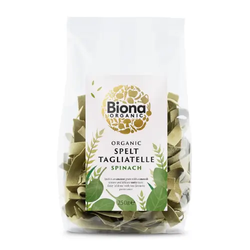 Biona Organic White Spelt Spinach Tagliatelle contains spelt, a nutritious grain with a smooth texture and delicate nutty taste. Spelt is one of the oldest cultivated grains and is high in fibre, with a higher content of protein and vitamins than wheat. Although not gluten free, spelt can be tolerated by some people with wheat allergies.